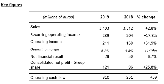 Operating cash flow improved by nearly €60 million to €310 million at the end of 2019, buoyed by the good operating performance.