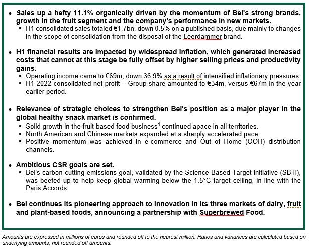 Cecile Beliot, Chief Executive Officer of the Bel Group, said: “Against a turbulent backdrop, the Bel Group reported solid volume growth in the first half of 2022. This performance resulted from the teamwork of our employees and the strength of our iconic brands, which offer healthy servings of dairy, fruit and plant-based foods everywhere in the world. The solid volume results, coupled with our product offering and price adjustments, generated organic sales growth of 11.1%, a performance further fuelled by accelerated expansion in our priority territories and categories, namely North America and Asia, and fruit and plant-based foods. These results confirm the relevance of our strategy. During the period, we reaffirmed our commitment to forging a path to a healthier and more sustainable food business model. We did this notably through key initiatives, such as strengthening our commitment to reducing our carbon footprint across Bel’s entire value chain by 2035, in line with the trajectory of the Paris Accords, expanding our regenerative agriculture pilot-program to include the United States and announcing an innovative and strategic partnership with startup Superbrewed to develop and introduce cheeses made from alternative proteins. The rollout of our CSR roadmap will not be slowed by the tough inflationary environment created by rising raw material prices and increases in all our production line expenses, including packaging, energy and transport costs. Our margin was severely impacted in the first half of the year due to the inherent lag in passing on higher prices to our customers. However, I remain confident in our ability to grow Bel and to restore our margins, while remaining cautious about volume growth in an environment of extreme market volatility.”