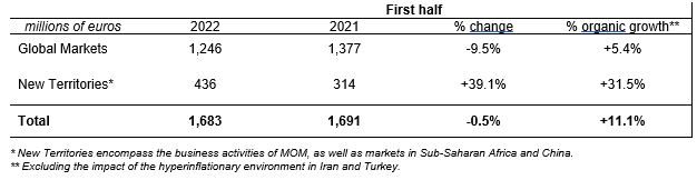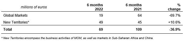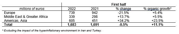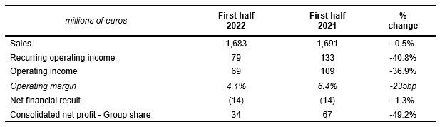 In the first half of 2022, consolidated operating income totaled €69 million, down 36.9% versus the first half of 2021.