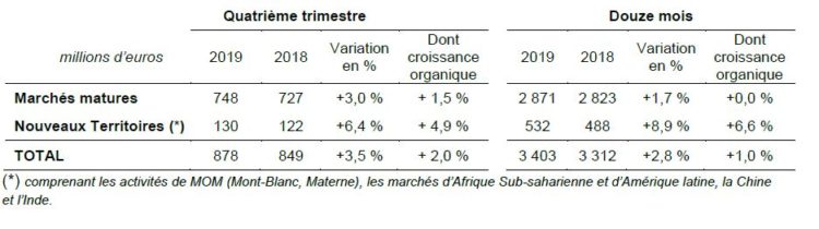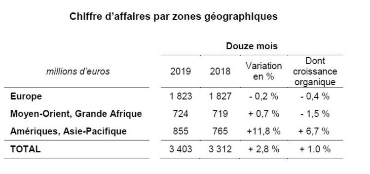 Chiffre d’affaires annuel : 3 403 M€, en croissance de + 2,8 % - Croissance organique 2019 : + 1,0 % - Forte dynamique dans les nouveaux territoires : + 6,6 % - Accélération de la croissance organique au 2nd semestre : + 1,8 % - Chiffre d’affaires du 4ème trimestre : 878 M€, + 2,0 % en organique